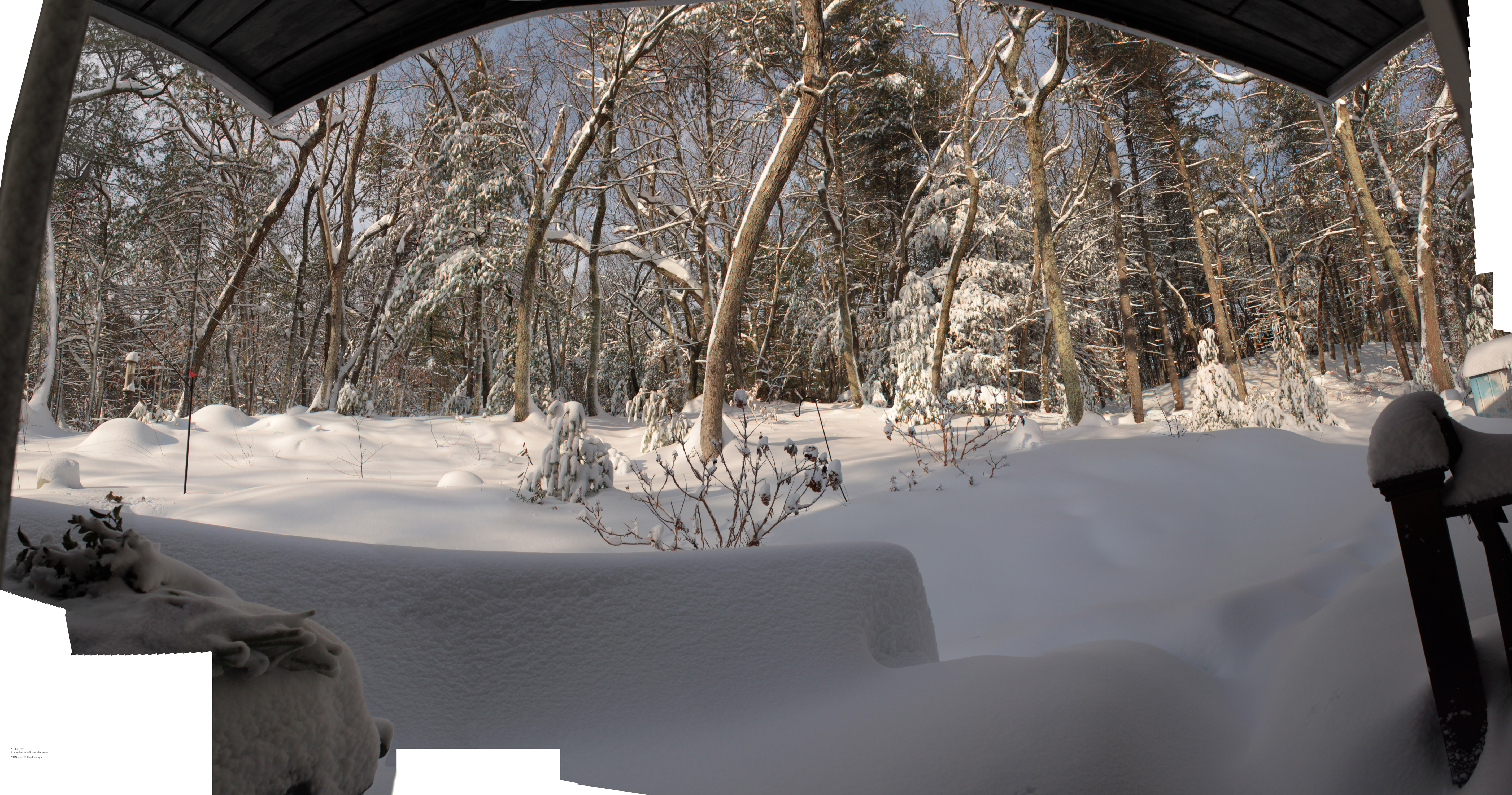 Stitched from 25-35 separate 4752x3168 pixels images with Photoshop - a lot of overlap, so, I'm not sure they all got used. Shot on the morning of January 17th, 2013 in the SVT's Memorial Forest.